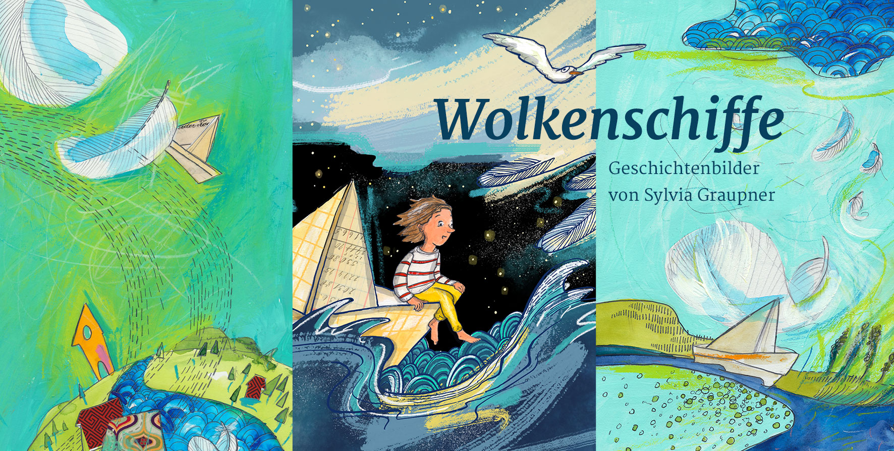 Manchmal tauchen sie auf, schweben lautlos über uns. Wer sie wahrnimmt und innehält, kann in den wechselnden Formen der Wolkenschiffe Phantastisches entdecken. Die Bilder der Ausstellung möchten mit uns in Resonanz kommen, nehmen uns mit auf eine Augenreise durch hellgrüne Tage und schenken hoffnungsvolles Leuchten, selbst wenn es „Im Papierschiff durch die Nacht“ geht, wie im neuen Bilderbuch der Künstlerin.
